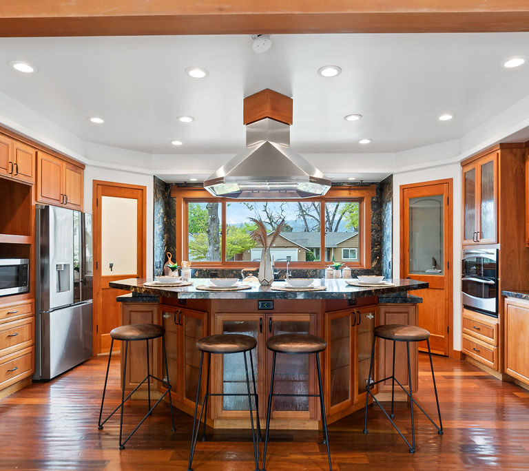 Chef’s kitchen’s highlights include high-tech appliances such as Wolf range/oven and Thermidor vent hood, two spacious pantries, custom granite counters, and island with seating.
