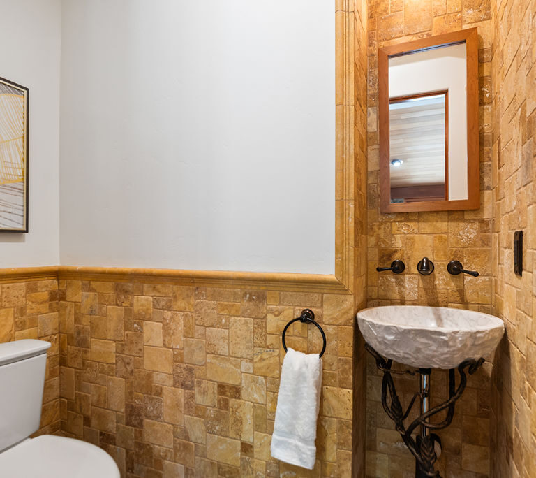 Guests will appreciate their elevated bathroom with deep soaking tub, luxury tilework with custom mosaic, and heated floor.