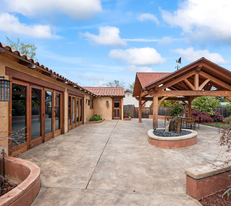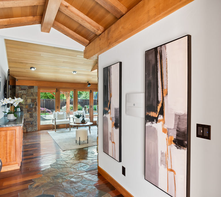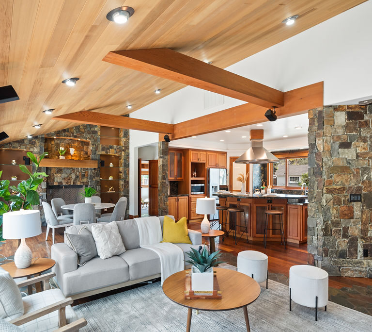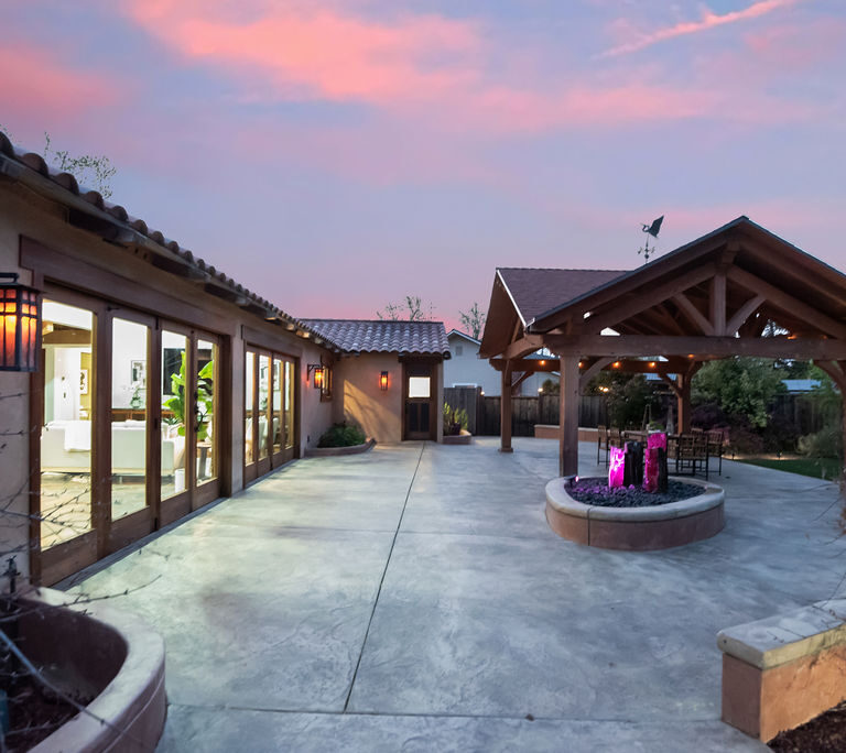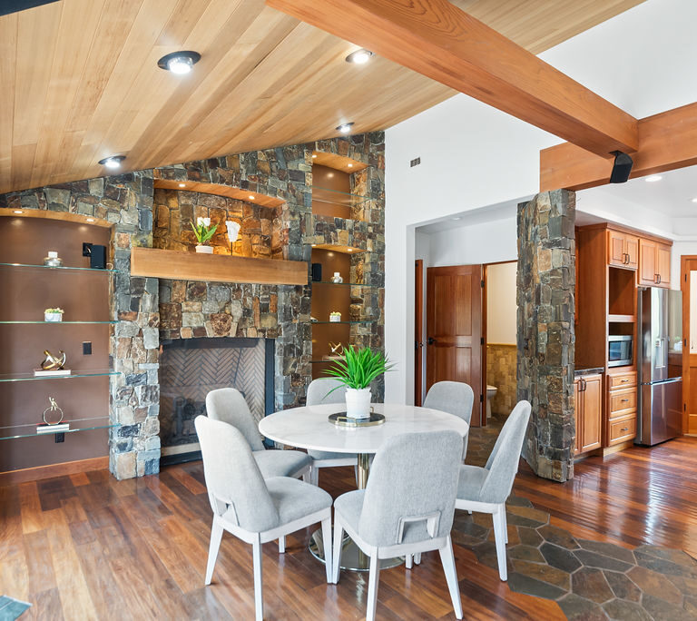 Open-concept layout boasts great room featuring custom stone pathway flooring and statement fireplace with built-in glass shelving. Floor-to-ceiling glass Nano doors create indoor-outdoor feel, and lead to backyard oasis with pavilion ready for gas and electricity, custom stone water feature, and low-maintenance landscaping. The oversized yard has ample room for RV and trailer, or additional seating area.
